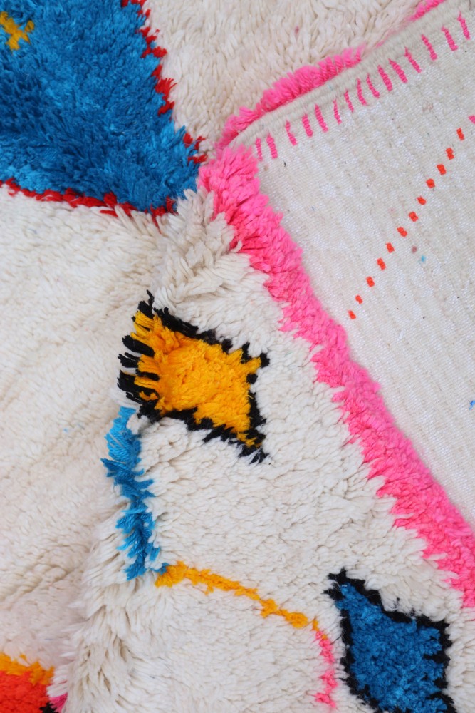 Questo tappeto berbero chiamato Azilal prende il nome dalla regione di Azilal in Marocco, dove è stato realizzato a mano su un telaio tradizionale in legno. I suoi motivi rappresentano gli stati d'animo, gli amori, i dolori della tessitrice al momento della sua creazione. Una volta che questo tappeto berbero colorato è stato creato, ne creerà un altro completamente diverso, in base alle sue emozioni del momento. Ogni pezzo è quindi unico.