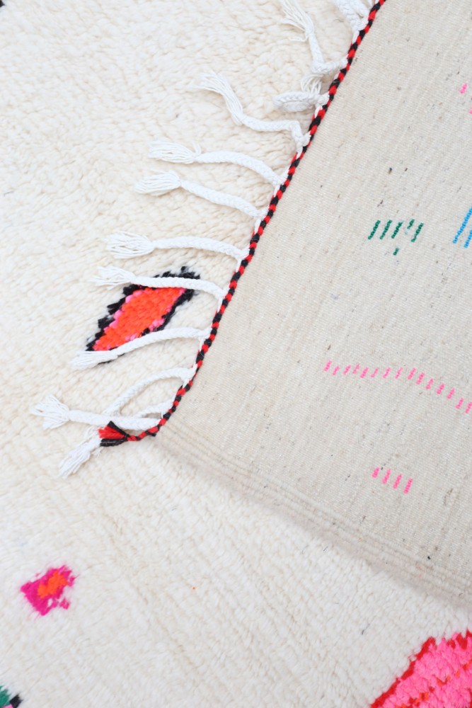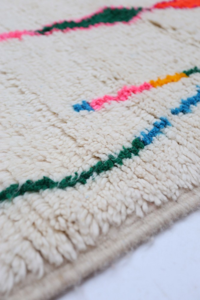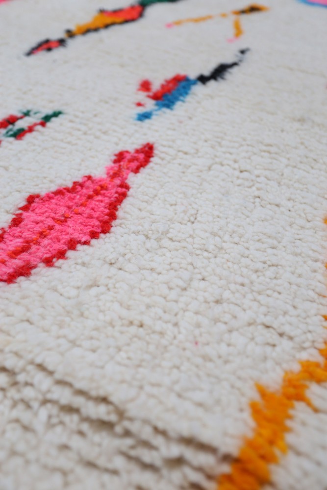 Questo tappeto berbero chiamato Azilal prende il nome dalla regione di Azilal in Marocco, dove è stato realizzato a mano su un telaio tradizionale in legno. I suoi motivi rappresentano gli stati d'animo, gli amori, i dolori della tessitrice al momento della sua creazione. Una volta che questo tappeto berbero colorato è stato creato, ne creerà un altro completamente diverso, in base alle sue emozioni del momento. Ogni pezzo è quindi unico.
