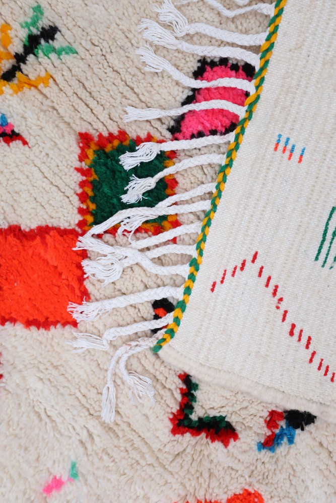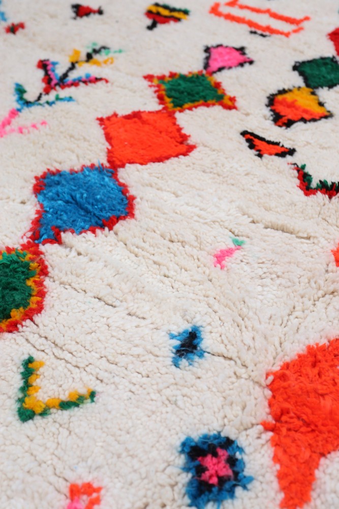 Questo tappeto berbero chiamato Azilal prende il nome dalla regione di Azilal in Marocco, dove è stato realizzato a mano su un telaio tradizionale in legno. I suoi motivi rappresentano gli stati d'animo, gli amori, i dolori della tessitrice al momento della sua creazione. Una volta che questo tappeto berbero colorato è stato creato, ne creerà un altro completamente diverso, in base alle sue emozioni del momento. Ogni pezzo è quindi unico.