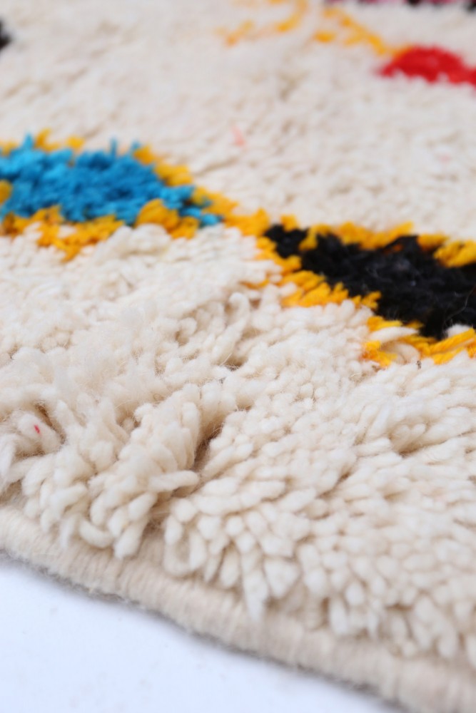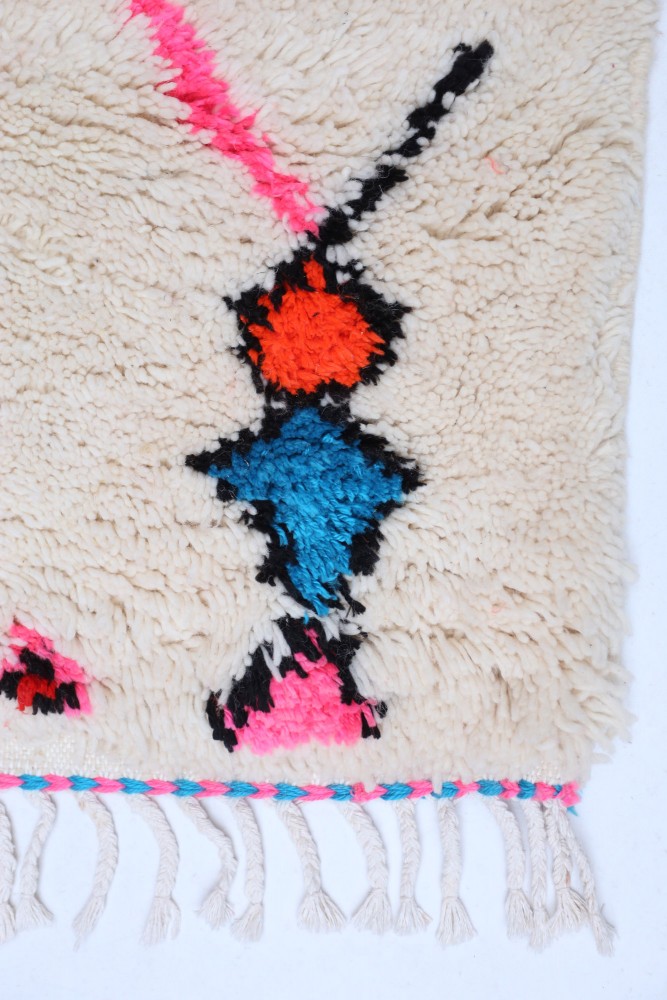 Questo tappeto berbero chiamato Azilal prende il nome dalla regione di Azilal in Marocco, dove è stato realizzato a mano su un telaio tradizionale in legno. I suoi motivi rappresentano gli stati d'animo, gli amori, i dolori della tessitrice al momento della sua creazione. Una volta che questo tappeto berbero colorato è stato creato, ne creerà un altro completamente diverso, in base alle sue emozioni del momento. Ogni pezzo è quindi unico.