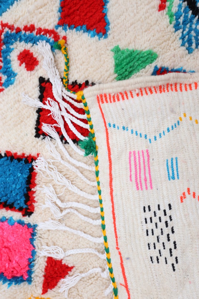 Questo tappeto berbero chiamato Azilal prende il nome dalla regione di Azilal in Marocco, dove è stato realizzato a mano su un telaio tradizionale in legno. I suoi motivi rappresentano gli stati d'animo, gli amori, i dolori della tessitrice al momento della sua creazione. Una volta che questo tappeto berbero colorato è stato creato, ne creerà un altro completamente diverso, in base alle sue emozioni del momento. Ogni pezzo è quindi unico.