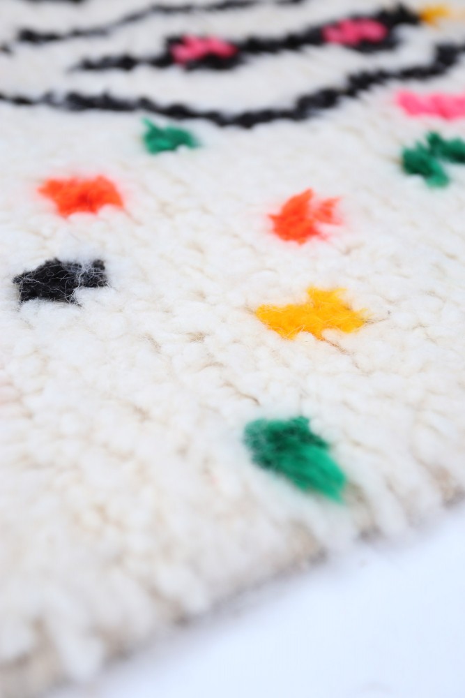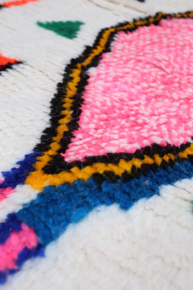 Questo tappeto berbero chiamato Azilal prende il nome dalla regione di Azilal in Marocco, dove è stato realizzato a mano su un telaio tradizionale in legno. I suoi motivi rappresentano gli stati d'animo, gli amori, i dolori della tessitrice al momento della sua creazione. Una volta che questo tappeto berbero colorato è stato creato, ne creerà un altro completamente diverso, in base alle sue emozioni del momento. Ogni pezzo è quindi unico.