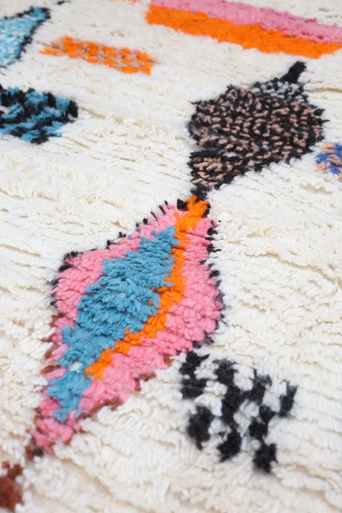 Questo tappeto berbero chiamato Azilal prende il nome dalla regione di Azilal in Marocco, dove è stato realizzato a mano su un telaio tradizionale in legno. I suoi motivi rappresentano gli stati d'animo, gli amori, i dolori della tessitrice al momento della sua creazione. Una volta che questo tappeto berbero colorato è stato creato, ne creerà un altro completamente diverso, in base alle sue emozioni del momento. Ogni pezzo è quindi unico.