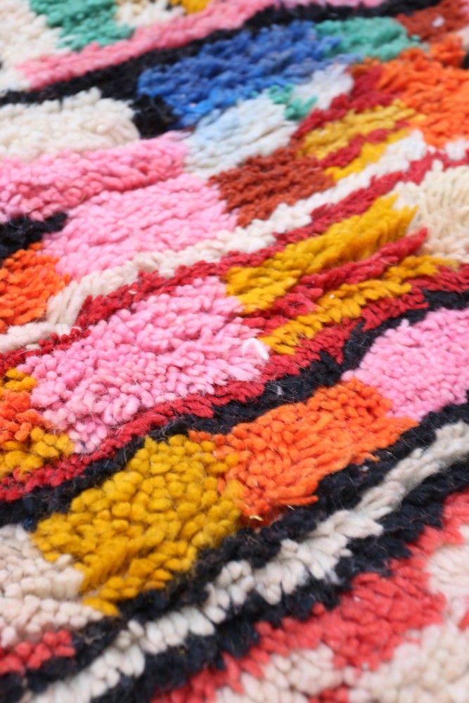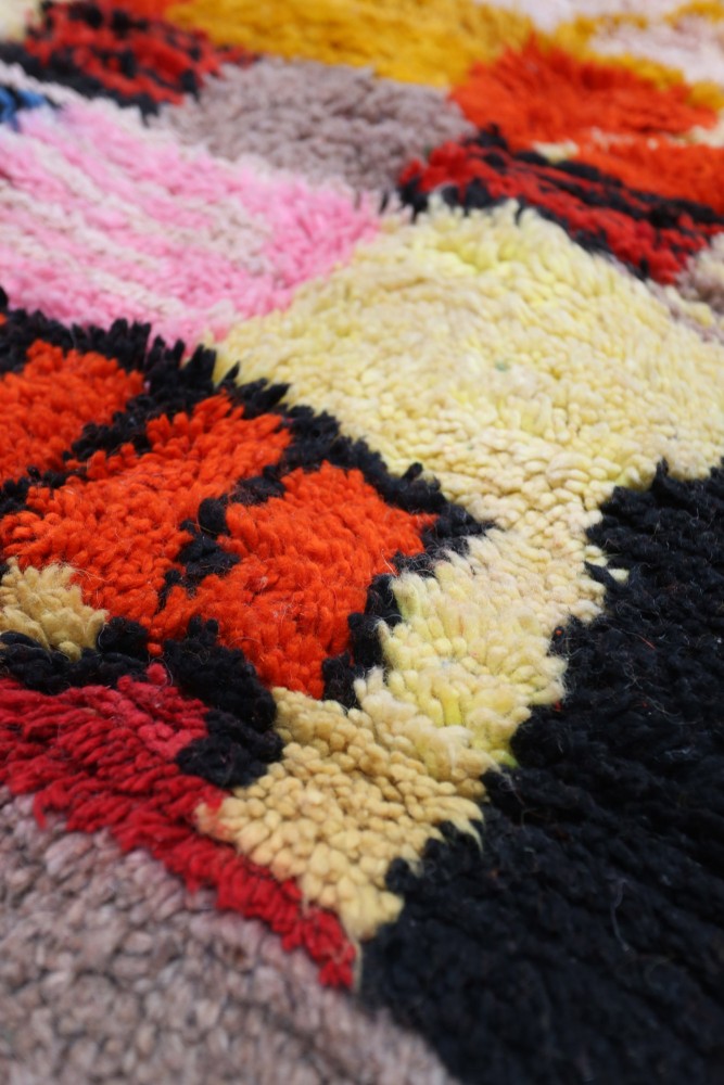 Questo tappeto berbero chiamato Azilal prende il nome dalla regione di Azilal in Marocco, dove è stato realizzato a mano su un telaio tradizionale in legno. I suoi motivi rappresentano gli stati d'animo, gli amori, i dolori della tessitrice al momento della sua creazione. Una volta che questo tappeto berbero colorato è stato creato, ne creerà un altro completamente diverso, in base alle sue emozioni del momento. Ogni pezzo è quindi unico.