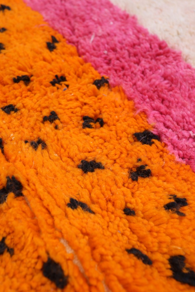 Questo tappeto berbero chiamato Azilal prende il nome dalla regione di Azilal in Marocco, dove è stato realizzato a mano su un telaio tradizionale in legno. I suoi motivi rappresentano gli stati d'animo, gli amori, i dolori della tessitrice al momento della sua creazione. Una volta che questo tappeto berbero colorato è stato creato, ne creerà un altro completamente diverso, in base alle sue emozioni del momento. Ogni pezzo è quindi unico.