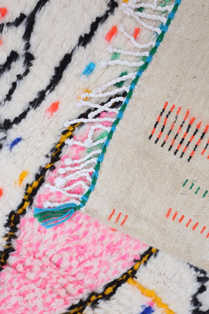Questo tappeto berbero chiamato Azilal prende il nome dalla regione di Azilal in Marocco, dove è stato realizzato a mano su un telaio tradizionale in legno. I suoi motivi rappresentano gli stati d'animo, gli amori, i dolori della tessitrice al momento della sua creazione. Una volta che questo tappeto berbero colorato è stato creato, ne creerà un altro completamente diverso, in base alle sue emozioni del momento. Ogni pezzo è quindi unico.