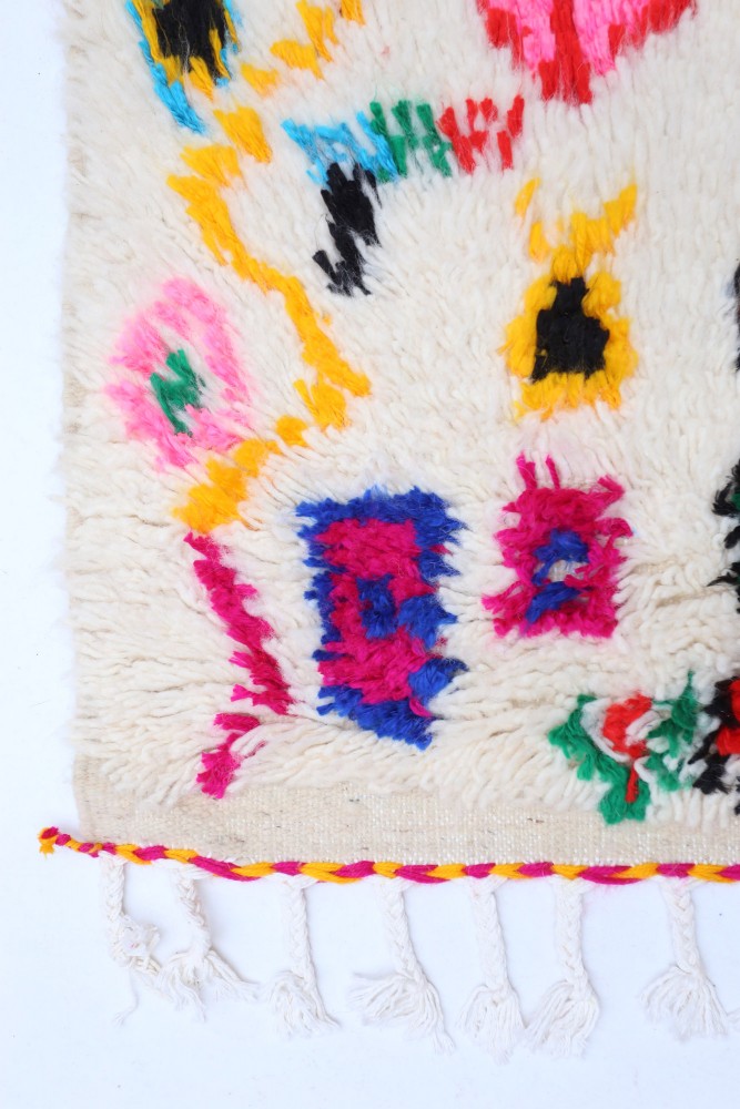 Questo tappeto berbero chiamato Azilal prende il nome dalla regione di Azilal in Marocco, dove è stato realizzato a mano su un telaio tradizionale in legno. I suoi motivi rappresentano gli stati d'animo, gli amori, i dolori della tessitrice al momento della sua creazione. Una volta che questo tappeto berbero colorato è stato creato, ne creerà un altro completamente diverso, in base alle sue emozioni del momento. Ogni pezzo è quindi unico.
