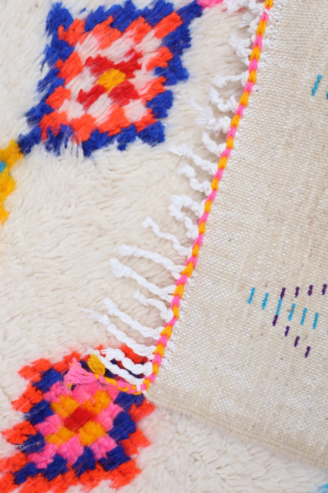Questo tappeto berbero chiamato Azilal prende il nome dalla regione di Azilal in Marocco, dove è stato realizzato a mano su un telaio tradizionale in legno. I suoi motivi rappresentano gli stati d'animo, gli amori, i dolori della tessitrice al momento della sua creazione. Una volta che questo tappeto berbero colorato è stato creato, ne creerà un altro completamente diverso, in base alle sue emozioni del momento. Ogni pezzo è quindi unico.