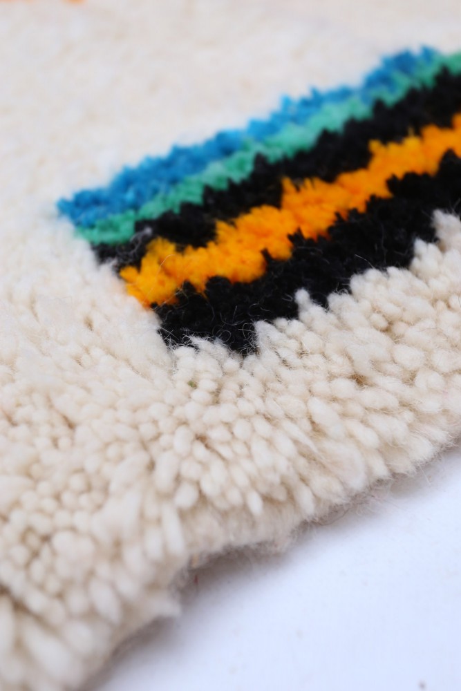 Questo tappeto berbero chiamato Azilal prende il nome dalla regione di Azilal in Marocco, dove è stato realizzato a mano su un telaio tradizionale in legno. I suoi motivi rappresentano gli stati d'animo, gli amori, i dolori della tessitrice al momento della sua creazione. Una volta che questo tappeto berbero colorato è stato creato, ne creerà un altro completamente diverso, in base alle sue emozioni del momento. Ogni pezzo è quindi unico.
