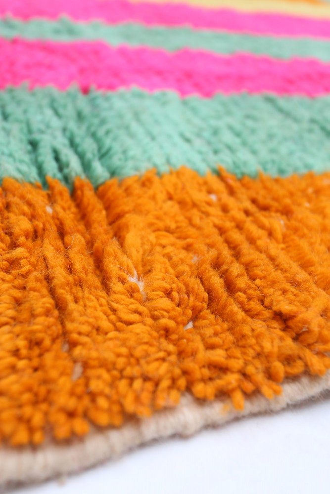 Questo tappeto berbero chiamato Azilal prende il nome dalla regione di Azilal in Marocco, dove è stato realizzato a mano su un telaio tradizionale in legno. I suoi motivi rappresentano gli stati d'animo, gli amori, i dolori della tessitrice al momento della sua creazione. Una volta che questo tappeto berbero colorato è stato creato, ne creerà un altro completamente diverso, in base alle sue emozioni del momento. Ogni pezzo è quindi unico.