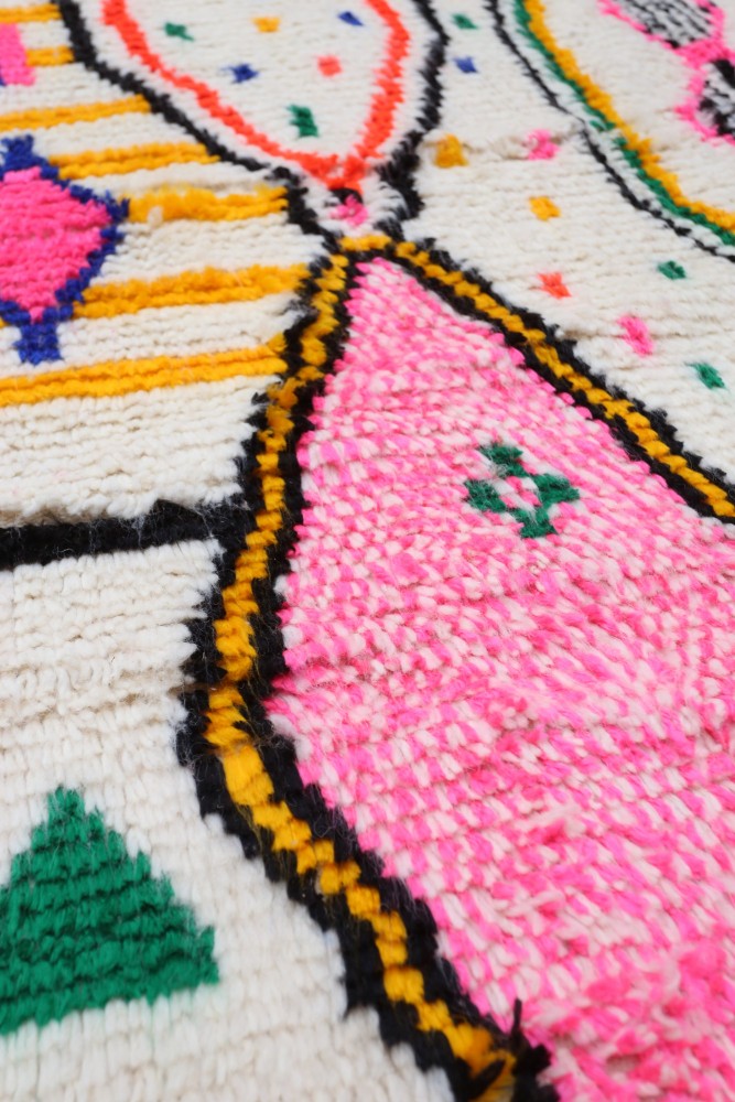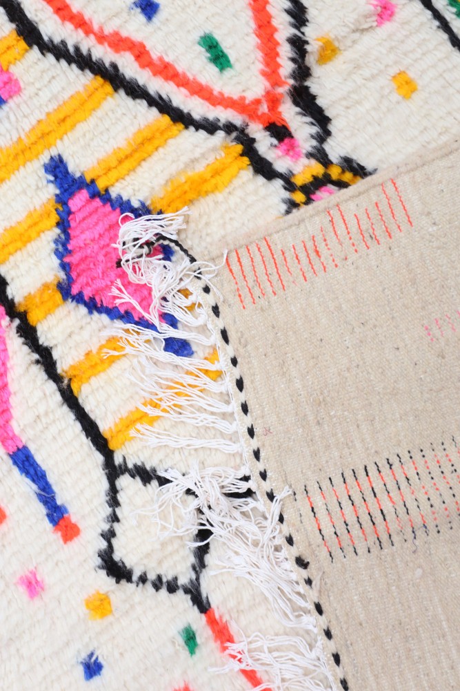 Questo tappeto berbero chiamato Azilal prende il nome dalla regione di Azilal in Marocco, dove è stato realizzato a mano su un telaio tradizionale in legno. I suoi motivi rappresentano gli stati d'animo, gli amori, i dolori della tessitrice al momento della sua creazione. Una volta che questo tappeto berbero colorato è stato creato, ne creerà un altro completamente diverso, in base alle sue emozioni del momento. Ogni pezzo è quindi unico.