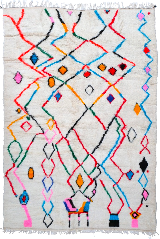 Questo tappeto berbero chiamato Azilal prende il nome dalla regione di Azilal in Marocco dove è stato realizzato a mano su un telaio tradizionale in legno. I suoi motivi rappresentano gli stati d'animo, gli amori, le sofferenze della tessitrice al momento della sua creazione. Una volta creato questo tappeto berbero colorato, ne creerà un altro completamente diverso, in base alle sue emozioni del momento. Ogni pezzo è quindi unico.