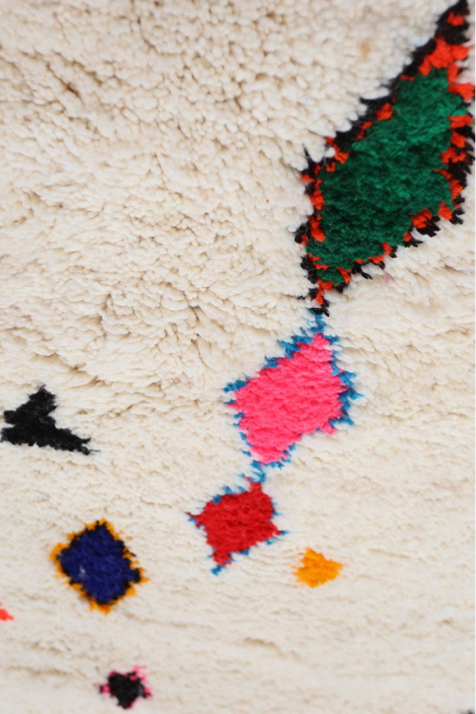 Questo tappeto berbero chiamato Azilal prende il nome dalla regione di Azilal in Marocco, dove è stato realizzato a mano su un telaio tradizionale in legno. I suoi motivi rappresentano gli stati d'animo, gli amori, i dolori della tessitrice al momento della sua creazione. Una volta che questo tappeto berbero colorato è stato creato, ne creerà un altro completamente diverso, in base alle sue emozioni del momento. Ogni pezzo è quindi unico.