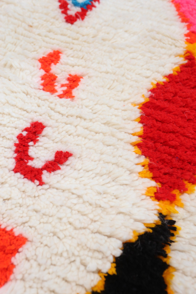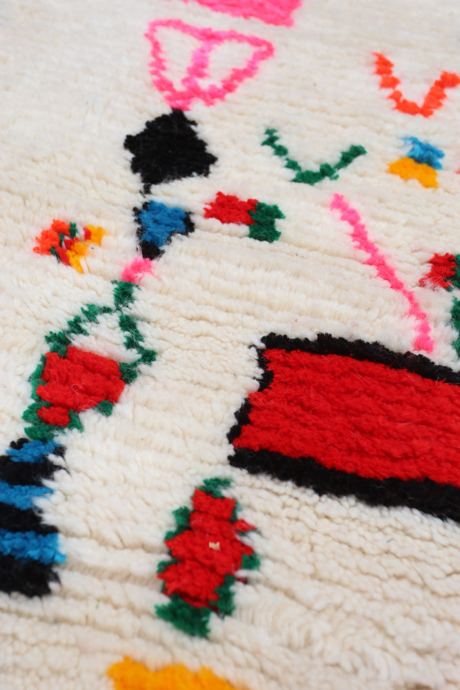Questo tappeto berbero chiamato Azilal prende il nome dalla regione di Azilal in Marocco, dove è stato realizzato a mano su un telaio tradizionale in legno. I suoi motivi rappresentano gli stati d'animo, gli amori, i dolori della tessitrice al momento della sua creazione. Una volta che questo tappeto berbero colorato è stato creato, ne creerà un altro completamente diverso, in base alle sue emozioni del momento. Ogni pezzo è quindi unico.