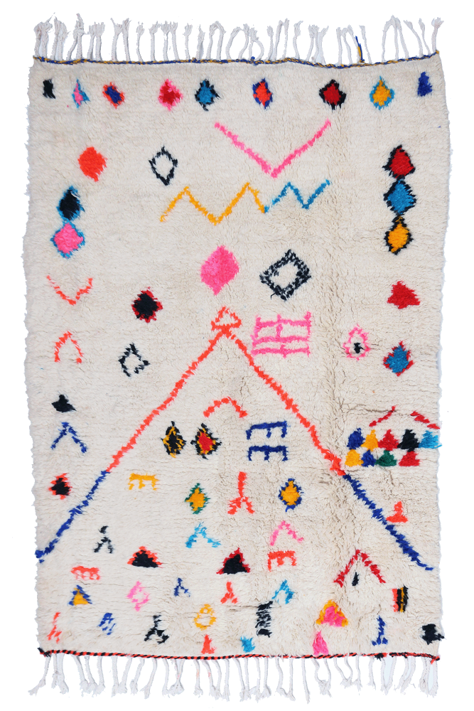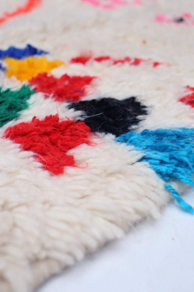 Questo tappeto berbero chiamato Azilal prende il nome dalla regione di Azilal in Marocco, dove è stato realizzato a mano su un telaio tradizionale in legno. I suoi motivi rappresentano gli stati d'animo, gli amori, i dolori della tessitrice al momento della sua creazione. Una volta che questo tappeto berbero colorato è stato creato, ne creerà un altro completamente diverso, in base alle sue emozioni del momento. Ogni pezzo è quindi unico.