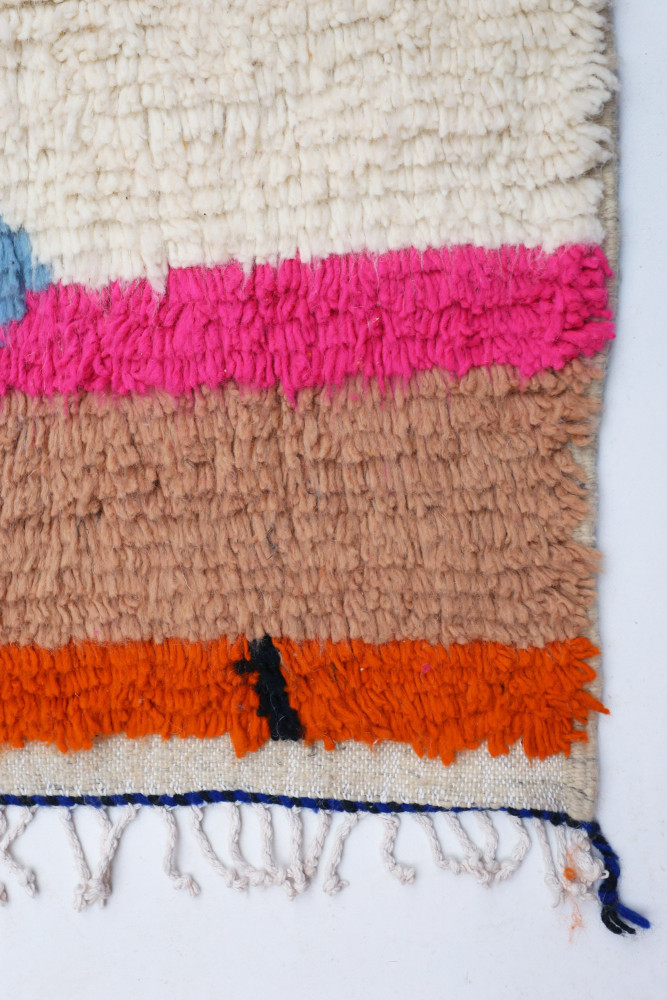 Questo tappeto berbero chiamato Azilal prende il nome dalla regione di Azilal in Marocco, dove è stato realizzato a mano su un telaio tradizionale in legno. I suoi motivi rappresentano gli stati d'animo, gli amori, i dolori della tessitrice al momento della sua creazione. Una volta che questo tappeto berbero colorato è stato creato, ne creerà un altro completamente diverso, in base alle sue emozioni del momento. Ogni pezzo è quindi unico.