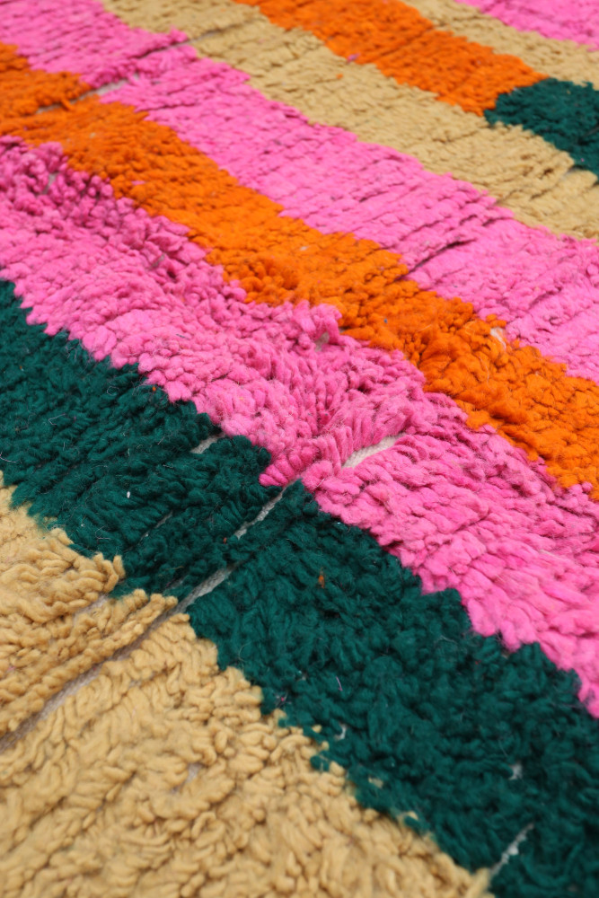Questo tappeto berbero chiamato Azilal prende il nome dalla regione di Azilal in Marocco, dove è stato realizzato a mano su un telaio tradizionale in legno. I suoi motivi rappresentano gli stati d'animo, gli amori, i dolori della tessitrice al momento della sua creazione. Una volta che questo tappeto berbero colorato è stato creato, ne creerà un altro completamente diverso, in base alle sue emozioni del momento. Ogni pezzo è quindi unico.