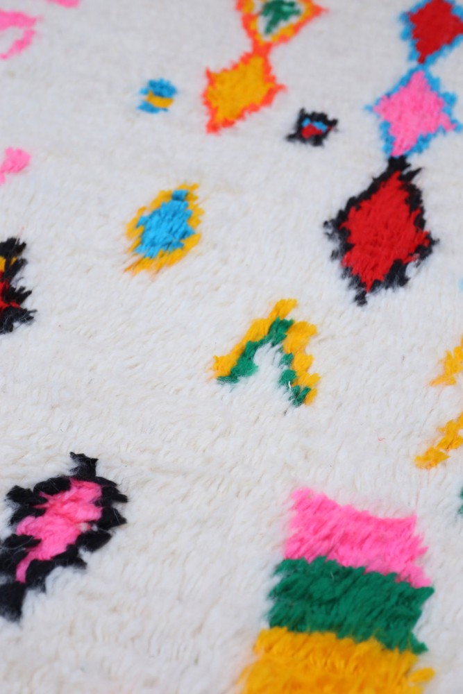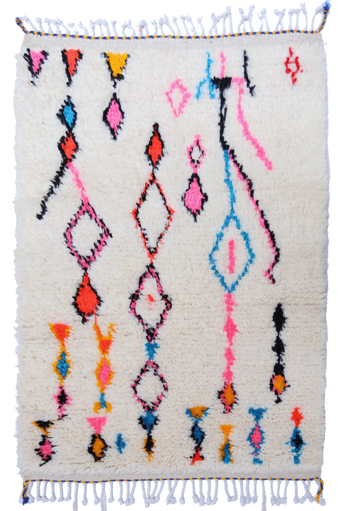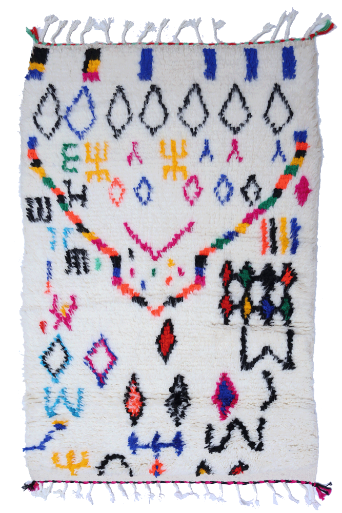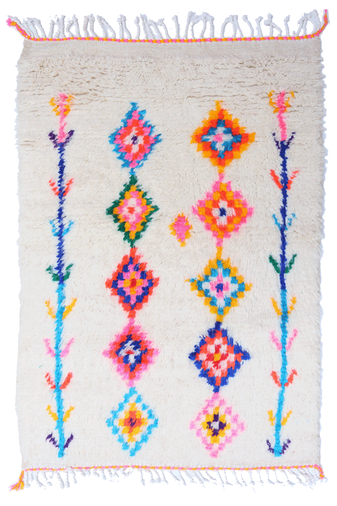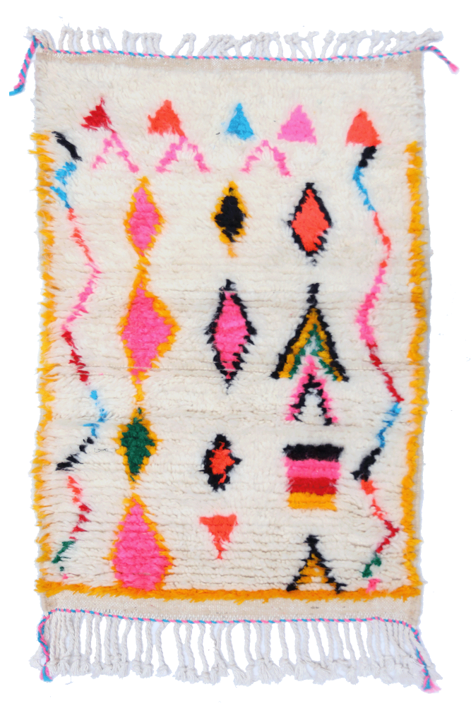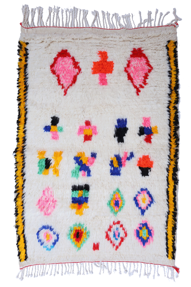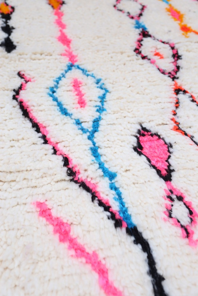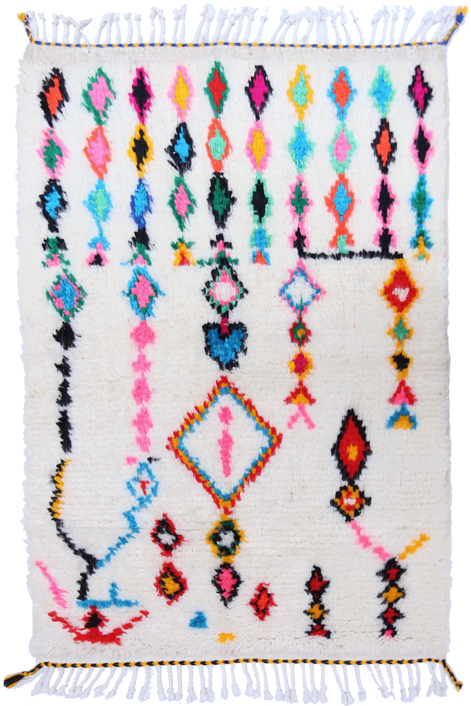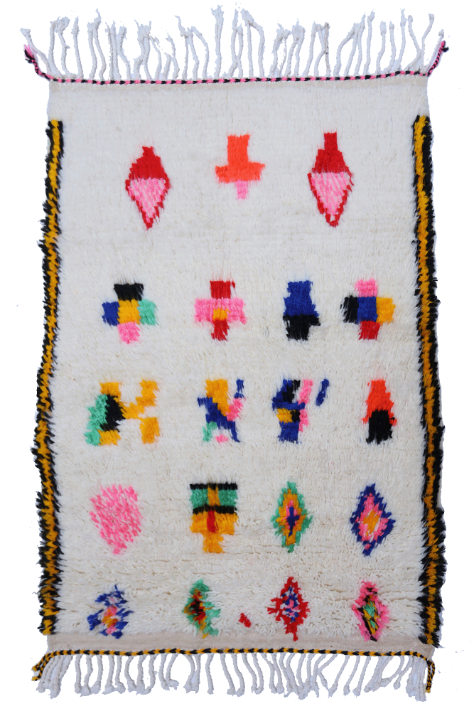 Liefhebber van felle kleuren en speelse patronen? Dan zul je worden verleid door de Azilal tapijt. Het is een echte decoratieve troef voor je leefruimte: de abstracte ontwerpen bevatten Berberse symbolen. Deze tapijten zijn gemaakt van gerecycled textiel en ruwe wol. Ze kunnen zowel langharig als kortpolig zijn. De motieven en grafische ontwerpen komen vooral goed tot hun recht op een crème, witte of ecru achtergrond.