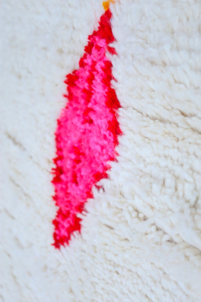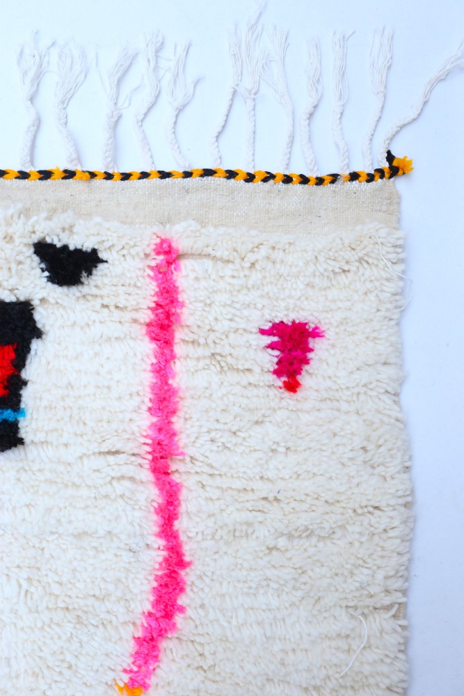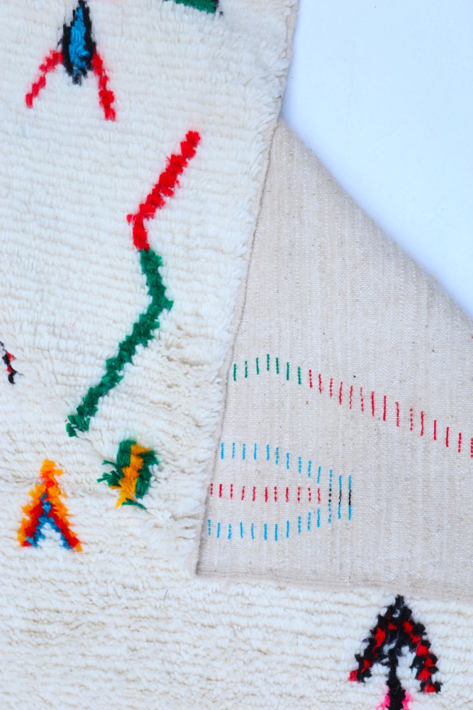 Deze Berberse tapijt genaamd Azilal dankt zijn naam aan de regio Azilal in Marokko waar het met de hand is geweven op een traditioneel houten weefgetouw. De patronen vertegenwoordigen de stemmingen, liefdes en verdriet van de weefster op het moment van creatie. Nadat dit gekleurde Berberse tapijt is gemaakt, zal ze een ander volledig verschillend tapijt maken, afhankelijk van haar emoties op dat moment. Elk stuk is dus uniek.