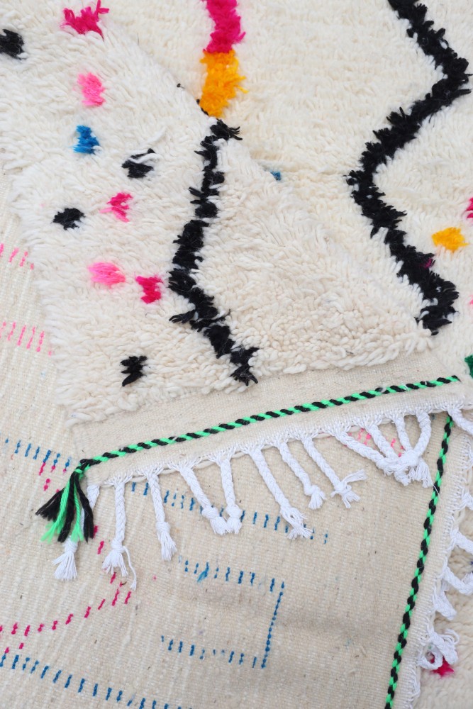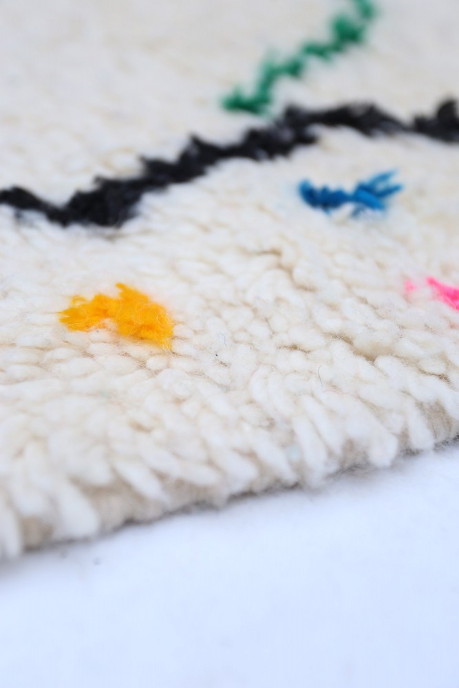 Deze Berberse tapijt die Azilal wordt genoemd, dankt zijn naam aan de regio Azilal in Marokko waar het met de hand is geweven op een traditioneel houten weefgetouw. De patronen vertegenwoordigen de stemmingen, liefdes en verdriet van de weefster op het moment van creatie. Nadat dit gekleurde Berberse tapijt is gemaakt, zal ze een ander compleet verschillend tapijt maken, afhankelijk van haar emoties op dat moment. Elk stuk is dus uniek.