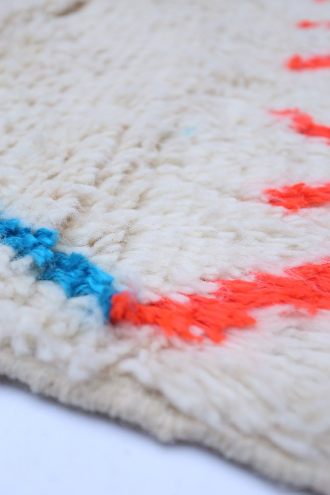 Dit Berber-tapijt, genaamd Azilal, dankt zijn naam aan de regio Azilal in Marokko waar het met de hand is geweven op een traditioneel houten weefgetouw. De motieven vertegenwoordigen de stemmingen, liefdes en verdriet van de weefster op het moment van creatie. Nadat dit gekleurde Berber-tapijt is gemaakt, zal ze een ander, volledig verschillend tapijt maken, afhankelijk van haar emoties op dat moment. Elk stuk is dus uniek.