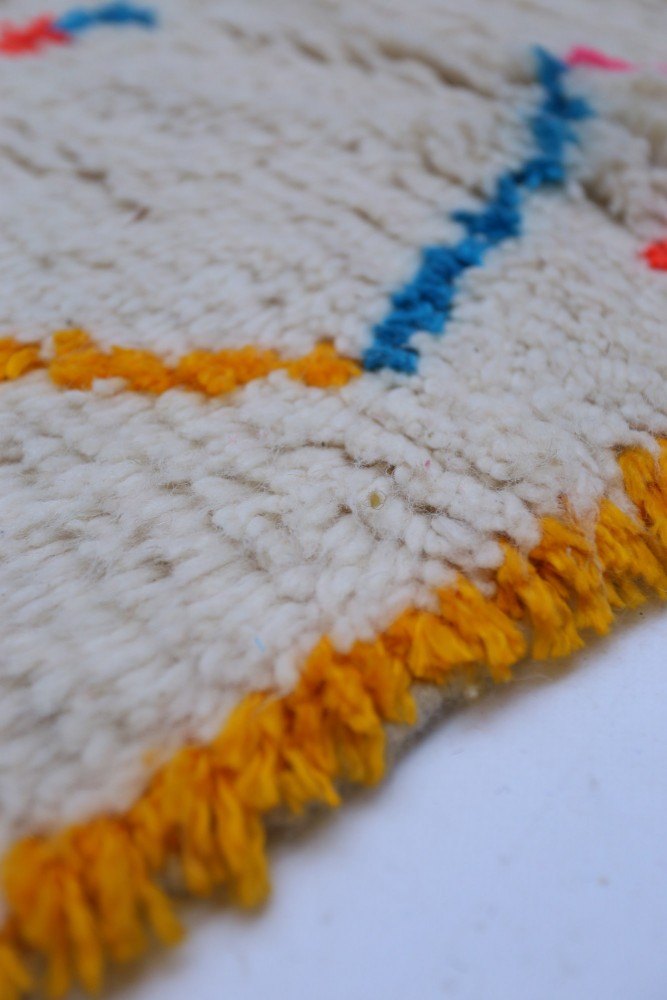 Deze Berberse tapijt die Azilal wordt genoemd, dankt zijn naam aan de regio Azilal in Marokko waar het met de hand is geweven op een traditioneel houten weefgetouw. De patronen vertegenwoordigen de stemmingen, liefdes en verdriet van de weefster op het moment van creatie. Nadat dit gekleurde Berberse tapijt is gemaakt, zal ze een ander compleet verschillend tapijt maken, afhankelijk van haar emoties op dat moment. Elk stuk is dus uniek.