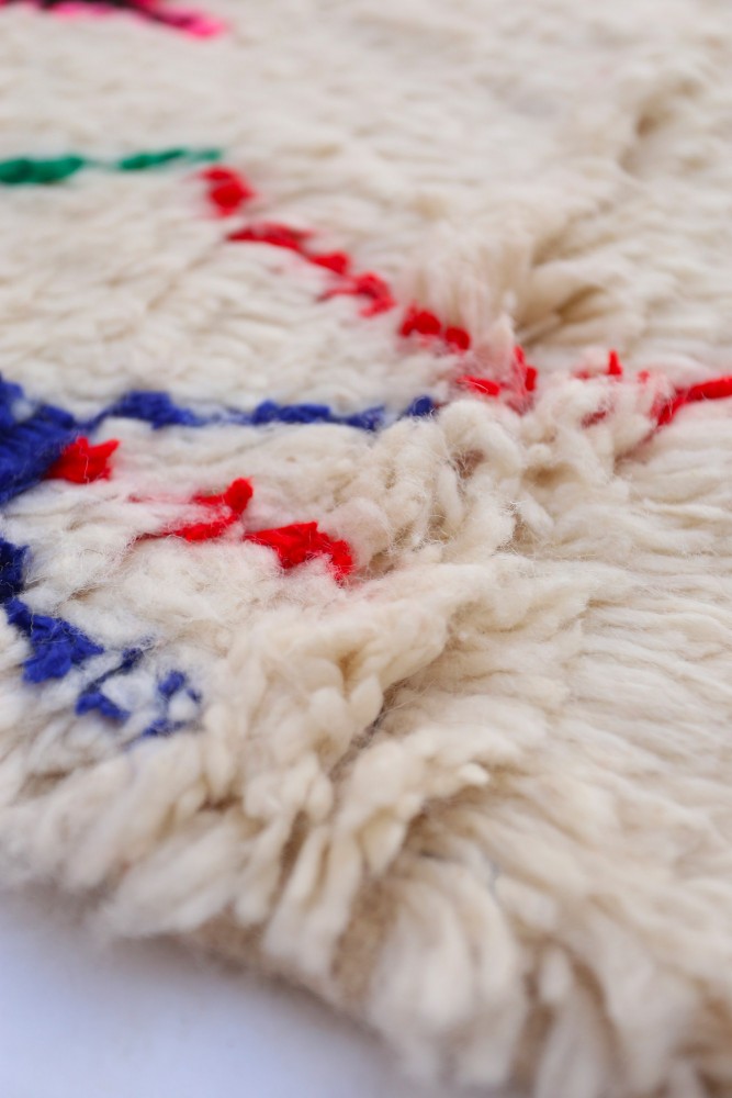 Deze Berberse tapijt genaamd Azilal dankt zijn naam aan de regio Azilal in Marokko waar het met de hand is geweven op een traditioneel houten weefgetouw. De patronen vertegenwoordigen de stemmingen, liefdes en verdriet van de weefster op het moment van creatie. Nadat dit gekleurde Berberse tapijt is gemaakt, zal ze een volledig ander tapijt maken, afhankelijk van haar emoties op dat moment. Elk stuk is dus uniek.