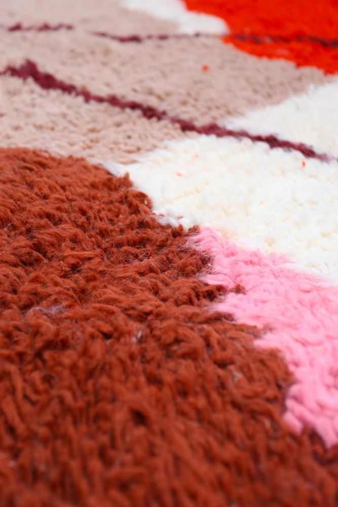 Deze Berber tapijt, genaamd Azilal, dankt zijn naam aan de regio Azilal in Marokko waar het met de hand is geweven op een traditioneel houten weefgetouw. De motieven vertegenwoordigen de stemmingen, liefdes en verdriet van de weefster op het moment van creatie. Nadat dit gekleurde Berber tapijt is gemaakt, zal ze een ander, volledig verschillend tapijt maken, afhankelijk van haar emoties op dat moment. Elk stuk is dus uniek.