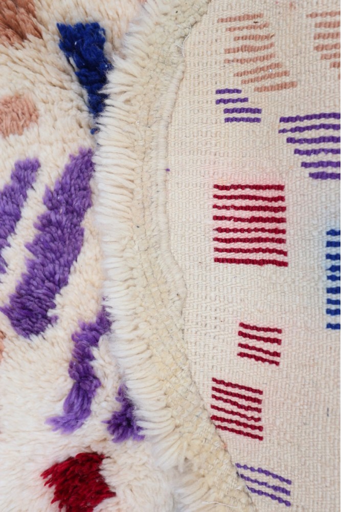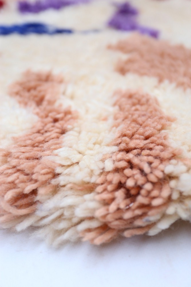 Deze Berberse tapijt genaamd Azilal dankt zijn naam aan de regio Azilal in Marokko waar het met de hand is geweven op een traditioneel houten weefgetouw. De patronen vertegenwoordigen de stemmingen, liefdes en verdriet van de weefster op het moment van creatie. Nadat dit gekleurde Berberse tapijt is gemaakt, zal ze een volledig ander tapijt maken, afhankelijk van haar emoties op dat moment. Elk stuk is dus uniek.