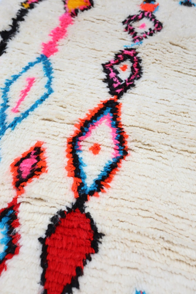 Deze Berberse tapijt genaamd Azilal dankt zijn naam aan de regio Azilal in Marokko waar het met de hand is geweven op een traditioneel houten weefgetouw. De patronen vertegenwoordigen de stemmingen, liefdes en verdriet van de weefster op het moment van creatie. Nadat dit gekleurde Berberse tapijt is gemaakt, zal ze een volledig ander tapijt maken, afhankelijk van haar emoties op dat moment. Elk stuk is dus uniek.