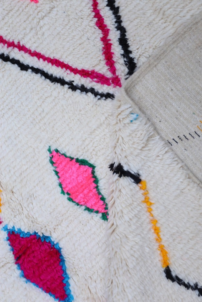 Dit Berber tapijt, genaamd Azilal, is vernoemd naar de regio Azilal in Marokko waar het met de hand is geweven op een traditioneel houten weefgetouw. De patronen vertegenwoordigen de stemmingen, liefdes en verdriet van de weefster op het moment van creatie. Nadat dit gekleurde Berber tapijt is gemaakt, zal ze een ander geheel ander tapijt maken, afhankelijk van haar emoties op dat moment. Elk stuk is dus uniek.