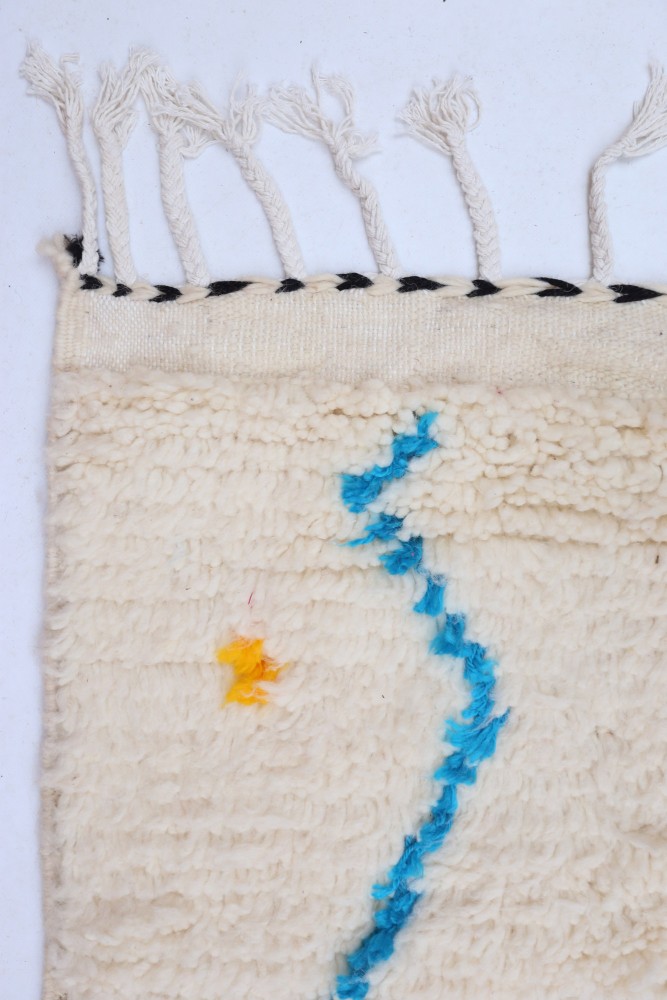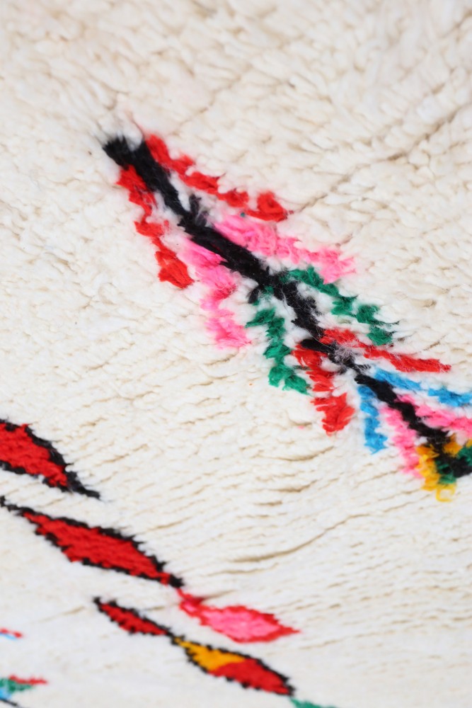 Deze Berberse tapijt genaamd Azilal dankt zijn naam aan de regio Azilal in Marokko waar het met de hand is geweven op een traditioneel houten weefgetouw. De patronen vertegenwoordigen de stemmingen, liefdes en verdriet van de weefster op het moment van creatie. Nadat dit gekleurde Berberse tapijt is gemaakt, zal ze een volledig ander tapijt maken, afhankelijk van haar emoties op dat moment. Elk stuk is dus uniek.