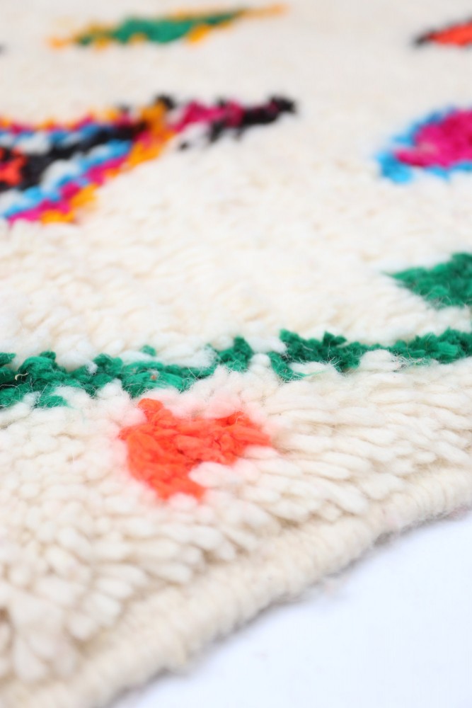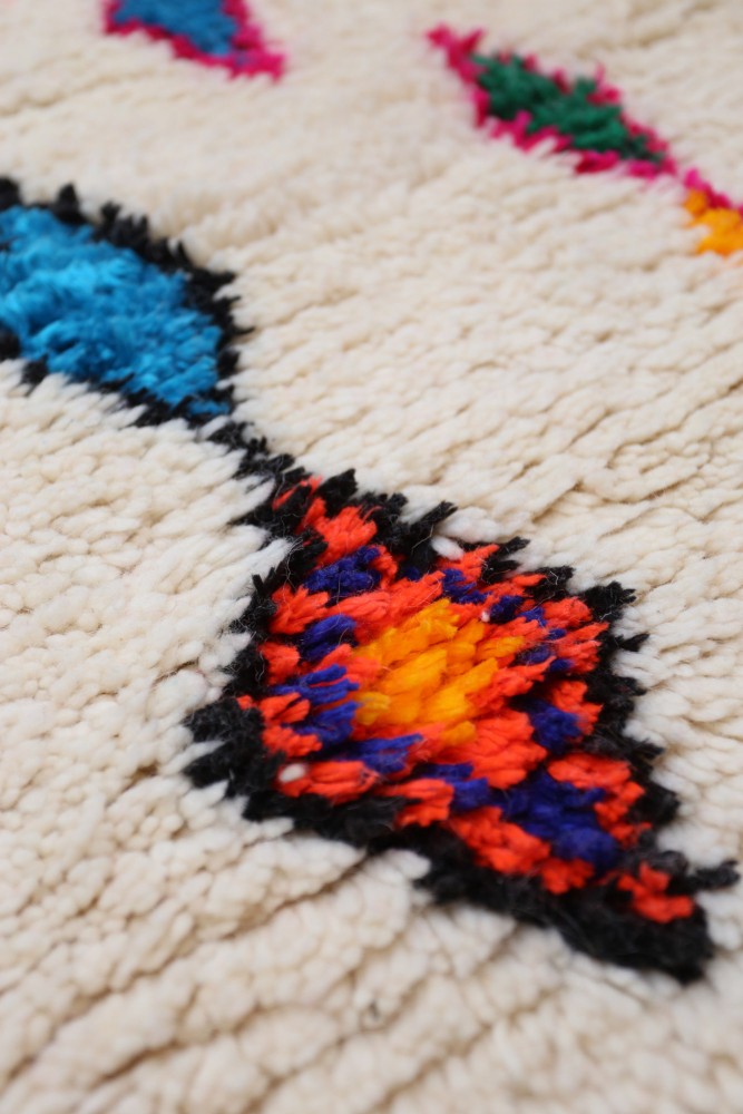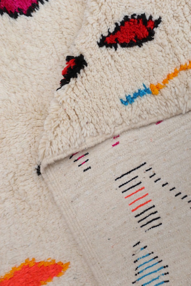 Deze Berberse tapijt genaamd Azilal dankt zijn naam aan de regio Azilal in Marokko waar het met de hand is geweven op een traditioneel houten weefgetouw. De patronen vertegenwoordigen de stemmingen, liefdes en verdriet van de weefster op het moment van creatie. Nadat dit gekleurde Berberse tapijt is gemaakt, zal ze een volledig ander tapijt maken, afhankelijk van haar emoties op dat moment. Elk stuk is dus uniek.