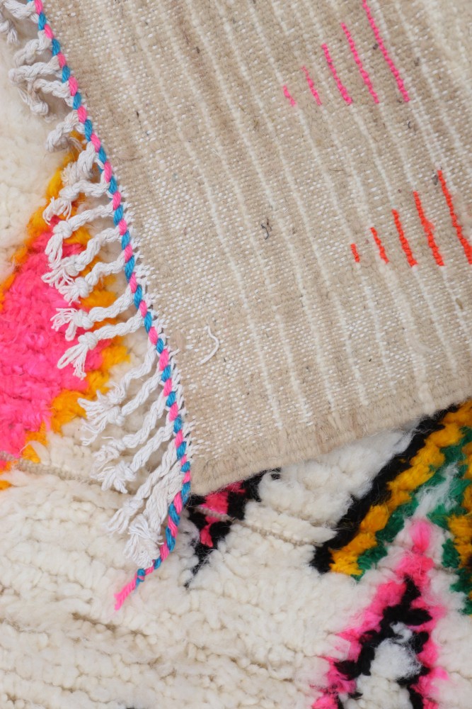 Deze Berberse tapijt genaamd Azilal dankt zijn naam aan de regio Azilal in Marokko waar het met de hand is geweven op een traditioneel houten weefgetouw. De patronen vertegenwoordigen de stemmingen, liefdes en verdriet van de weefster op het moment van creatie. Nadat dit gekleurde Berberse tapijt is gemaakt, zal ze een volledig ander tapijt maken, afhankelijk van haar emoties op dat moment. Elk stuk is dus uniek.