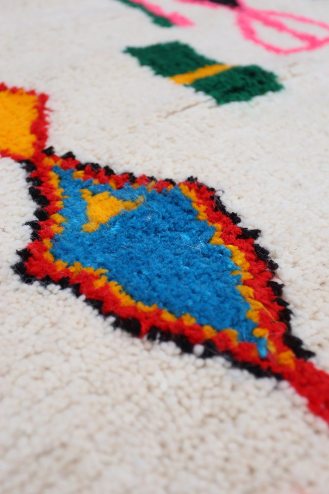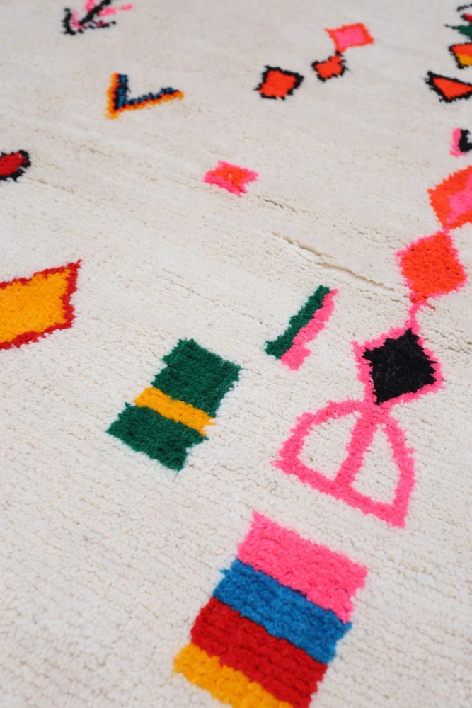 Deze Berberse tapijt genaamd Azilal dankt zijn naam aan de regio Azilal in Marokko waar het met de hand is geweven op een traditioneel houten weefgetouw. De patronen vertegenwoordigen de stemmingen, liefdes en verdriet van de weefster op het moment van creatie. Nadat dit gekleurde Berberse tapijt is gemaakt, zal ze een volledig ander tapijt maken, afhankelijk van haar emoties op dat moment. Elk stuk is dus uniek.