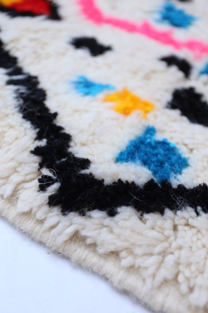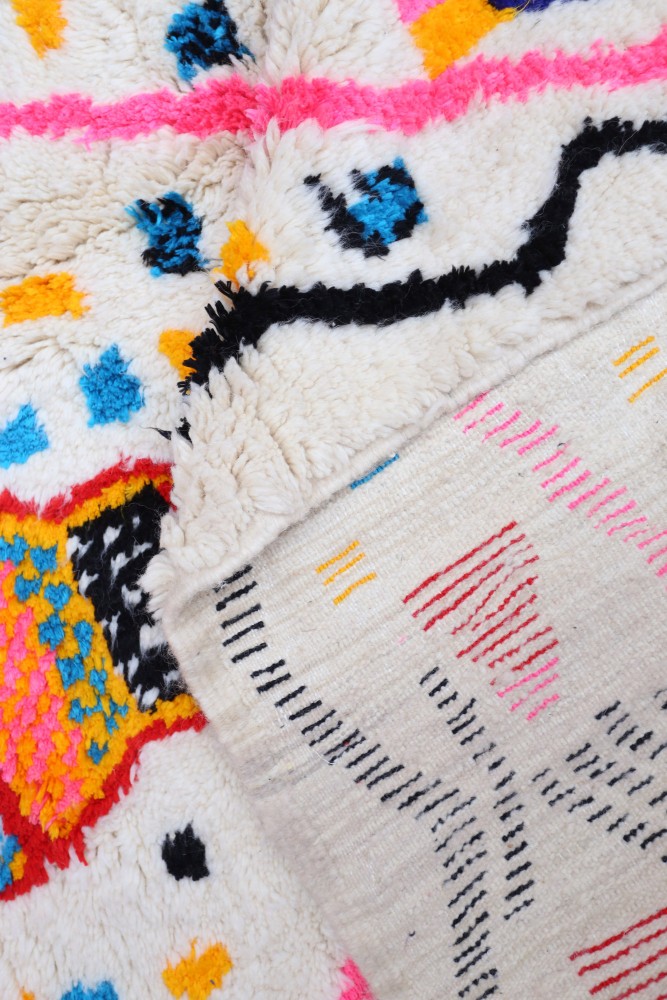 Deze Berberse tapijt genaamd Azilal dankt zijn naam aan de regio Azilal in Marokko waar het met de hand is geweven op een traditioneel houten weefgetouw. De patronen vertegenwoordigen de stemmingen, liefdes en verdriet van de weefster op het moment van creatie. Nadat dit gekleurde Berberse tapijt is gemaakt, zal ze een volledig ander tapijt maken, afhankelijk van haar emoties op dat moment. Elk stuk is dus uniek.