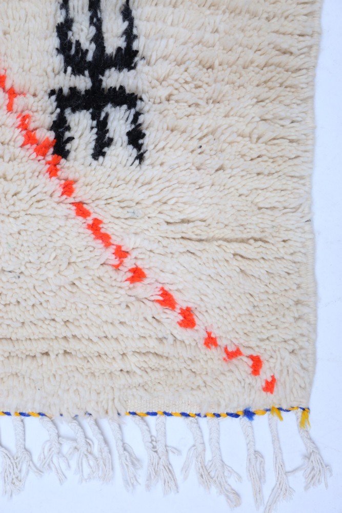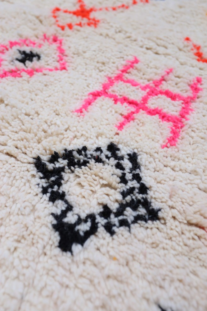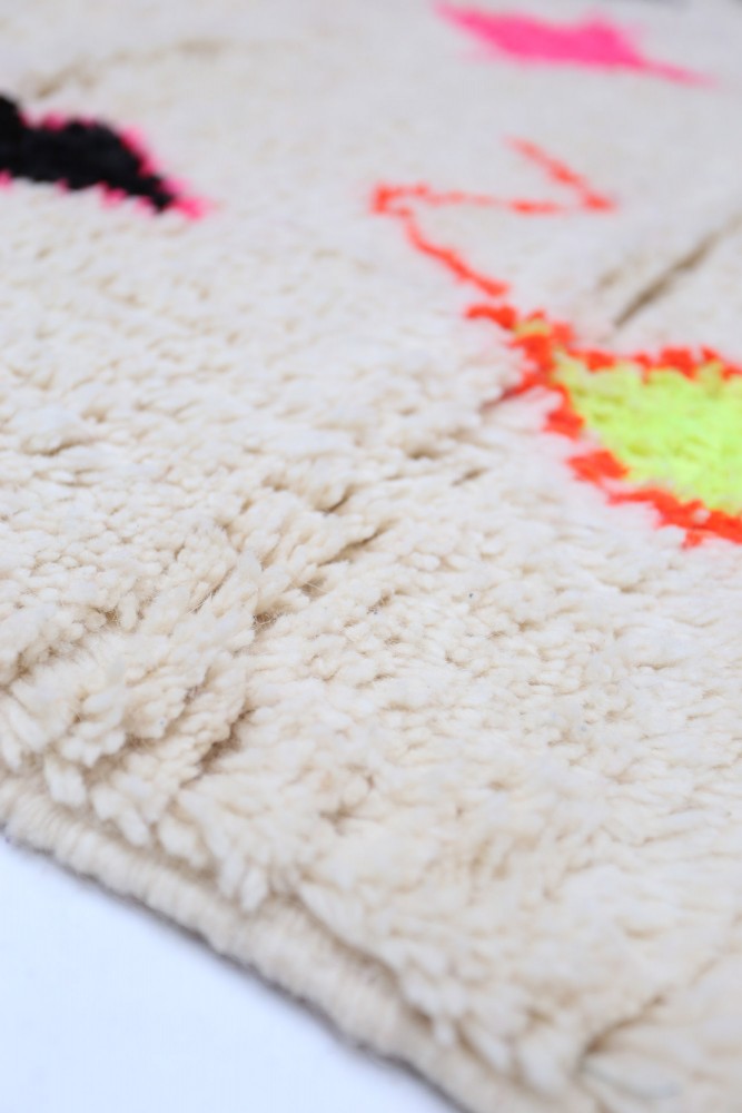 Deze Berberse tapijt genaamd Azilal dankt zijn naam aan de regio Azilal in Marokko waar het met de hand is geweven op een traditioneel houten weefgetouw. De patronen vertegenwoordigen de stemmingen, liefdes en verdriet van de weefster op het moment van creatie. Nadat dit gekleurde Berberse tapijt is gemaakt, zal ze een volledig ander tapijt maken, afhankelijk van haar emoties op dat moment. Elk stuk is dus uniek.