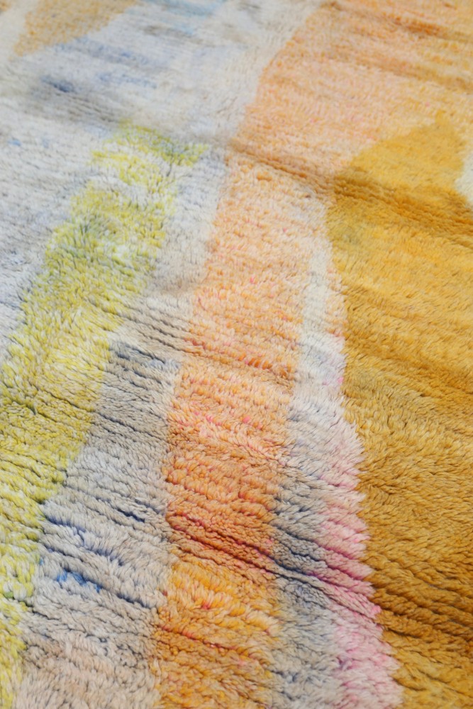 Deze Berberse tapijt genaamd Azilal dankt zijn naam aan de regio Azilal in Marokko waar het met de hand is geweven op een traditioneel houten weefgetouw. De patronen vertegenwoordigen de stemmingen, liefdes en verdriet van de weefster op het moment van creatie. Nadat dit gekleurde Berberse tapijt is gemaakt, zal ze een volledig ander tapijt maken, afhankelijk van haar emoties op dat moment. Elk stuk is dus uniek.