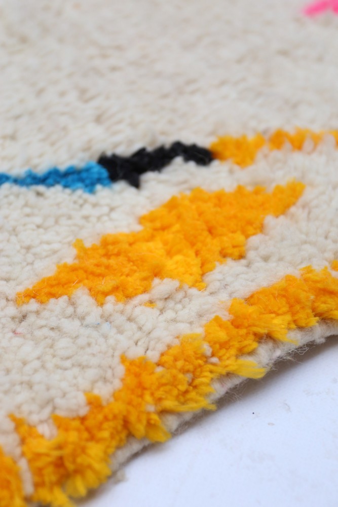 Deze Berberse tapijt genaamd Azilal dankt zijn naam aan de regio Azilal in Marokko waar het met de hand is geweven op een traditioneel houten weefgetouw. De patronen vertegenwoordigen de stemmingen, liefdes en verdriet van de weefster op het moment van creatie. Nadat dit gekleurde Berberse tapijt is gemaakt, zal ze een volledig ander tapijt maken, afhankelijk van haar emoties op dat moment. Elk stuk is dus uniek.