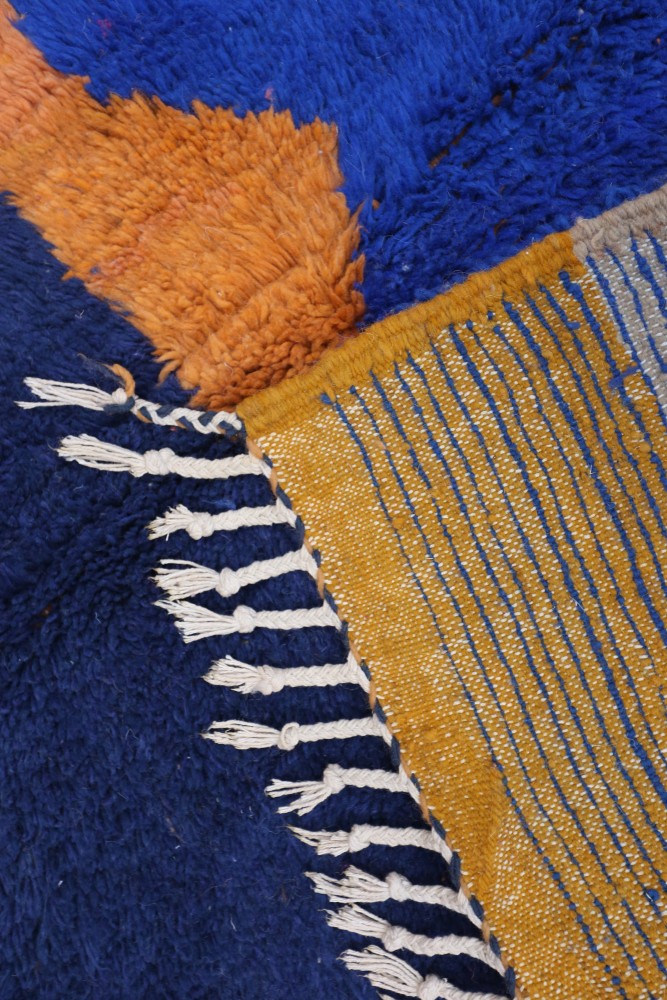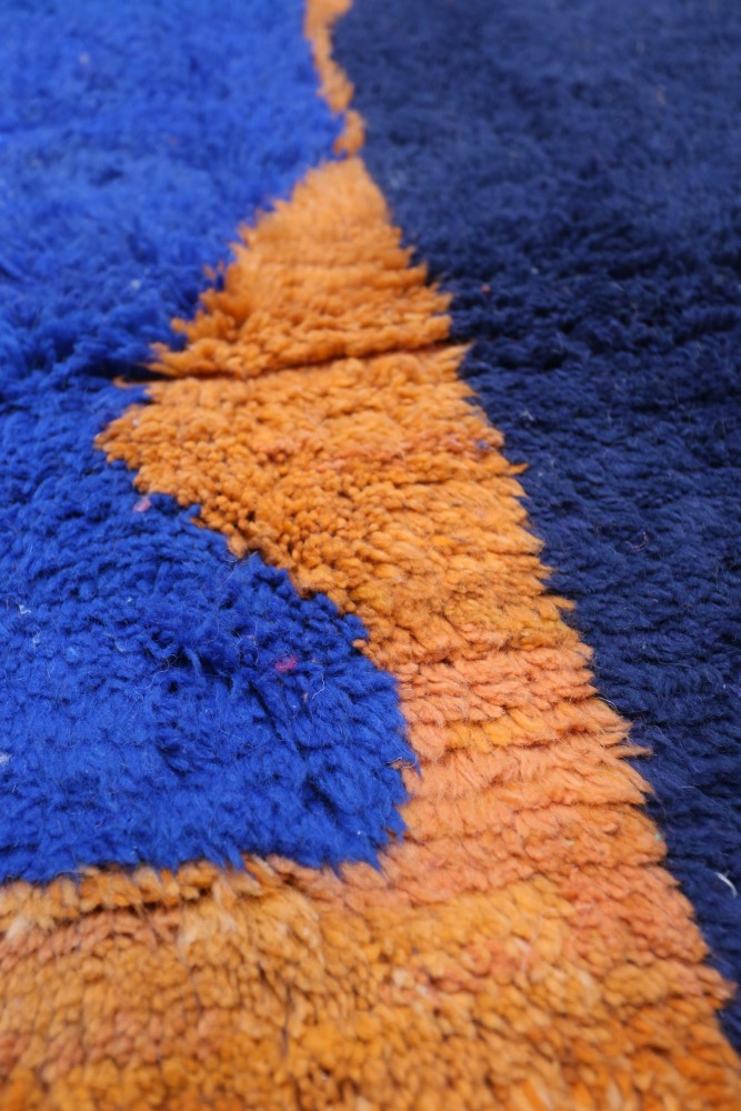 Deze Berber tapijt, genaamd Azilal, dankt zijn naam aan de regio Azilal in Marokko waar het met de hand is geweven op een traditioneel houten weefgetouw. De motieven vertegenwoordigen de stemmingen, liefdes en verdriet van de weefster op het moment van creatie. Nadat dit gekleurde Berber tapijt is gemaakt, zal ze een ander, volledig verschillend tapijt maken, afhankelijk van haar emoties op dat moment. Elk stuk is dus uniek.