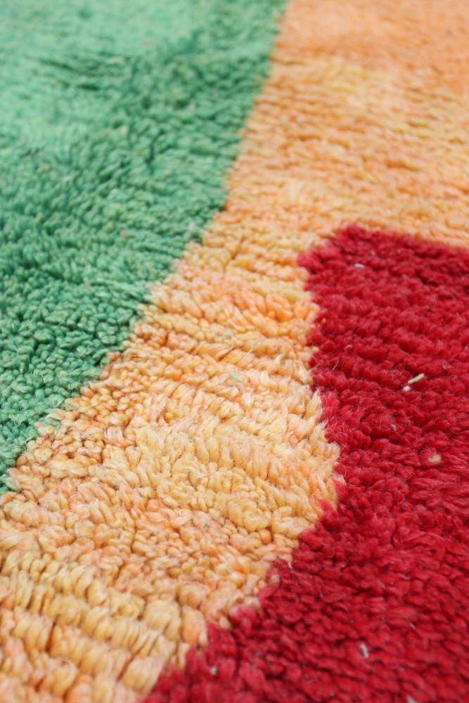 Deze Berberse tapijt genaamd Azilal dankt zijn naam aan de regio Azilal in Marokko waar het met de hand is geweven op een traditioneel houten weefgetouw. De patronen vertegenwoordigen de stemmingen, liefdes en verdriet van de weefster op het moment van creatie. Nadat dit gekleurde Berberse tapijt is gemaakt, zal ze een volledig ander tapijt maken, afhankelijk van haar emoties op dat moment. Elk stuk is dus uniek.