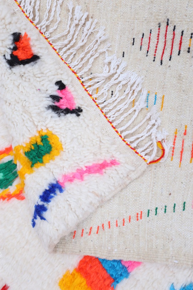 Deze Berberse tapijt genaamd Azilal dankt zijn naam aan de regio Azilal in Marokko waar het met de hand is geweven op een traditioneel houten weefgetouw. De patronen vertegenwoordigen de stemmingen, liefdes en verdriet van de weefster op het moment van creatie. Nadat dit gekleurde Berberse tapijt is gemaakt, zal ze een volledig ander tapijt maken, afhankelijk van haar emoties op dat moment. Elk stuk is dus uniek.