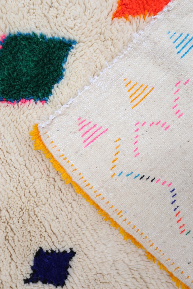 Deze Berberse tapijt genaamd Azilal dankt zijn naam aan de regio Azilal in Marokko waar het met de hand is geweven op een traditioneel houten weefgetouw. De patronen vertegenwoordigen de stemmingen, liefdes en verdriet van de weefster op het moment van creatie. Nadat dit gekleurde Berberse tapijt is gemaakt, zal ze een volledig ander tapijt maken, afhankelijk van haar emoties op dat moment. Elk stuk is dus uniek.