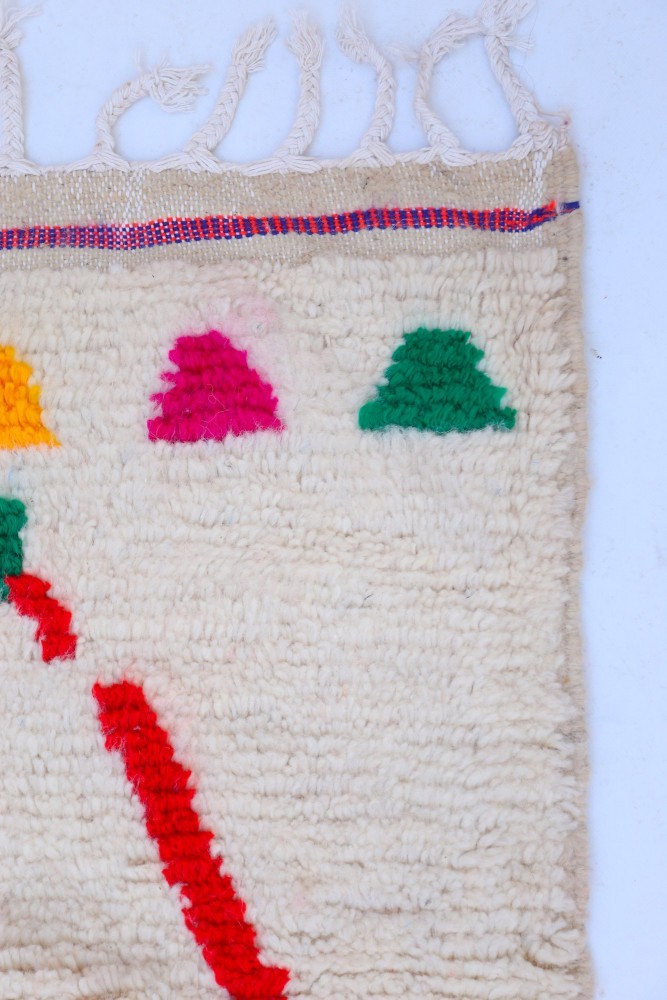 Deze Berber tapijt, genaamd Azilal, dankt zijn naam aan de regio Azilal in Marokko waar het met de hand is geweven op een traditioneel houten weefgetouw. De motieven vertegenwoordigen de stemmingen, liefdes en verdriet van de weefster op het moment van creatie. Nadat dit gekleurde Berber tapijt is gemaakt, zal ze een ander, volledig verschillend tapijt maken, afhankelijk van haar emoties op dat moment. Elk stuk is dus uniek.
