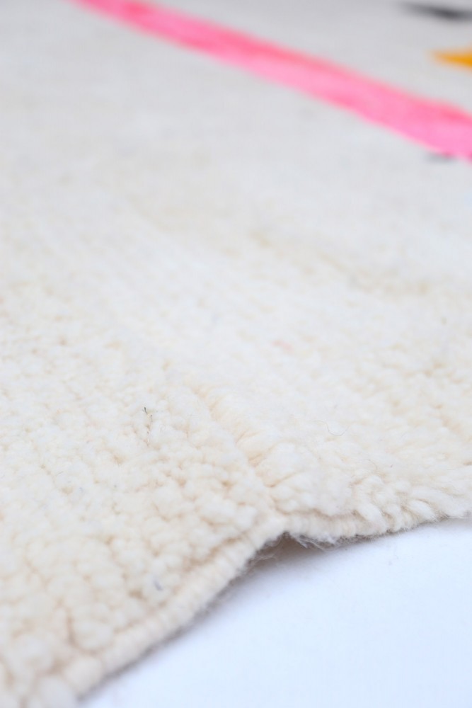 Deze Berberse tapijt genaamd Azilal dankt zijn naam aan de regio Azilal in Marokko waar het met de hand is geweven op een traditioneel houten weefgetouw. De patronen vertegenwoordigen de stemmingen, liefdes en verdriet van de weefster op het moment van creatie. Nadat dit gekleurde Berberse tapijt is gemaakt, zal ze een volledig ander tapijt maken, afhankelijk van haar emoties op dat moment. Elk stuk is dus uniek.