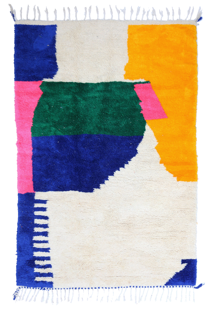 Deze Berberse tapijt genaamd Azilal dankt zijn naam aan de regio Azilal in Marokko waar het met de hand is geweven op een traditioneel houten weefgetouw. De patronen vertegenwoordigen de stemmingen, liefdes en verdriet van de weefster op het moment van creatie. Nadat dit gekleurde Berberse tapijt is gemaakt, zal ze een volledig ander tapijt maken, afhankelijk van haar emoties op dat moment. Elk stuk is dus uniek.