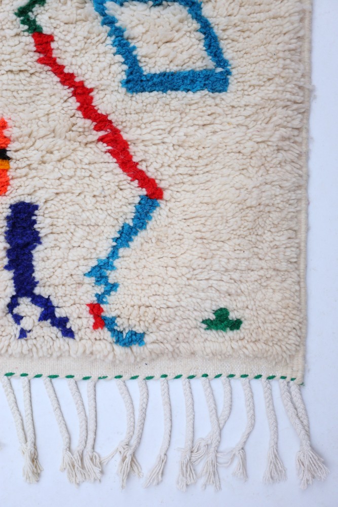 Deze Berberse tapijt genaamd Azilal dankt zijn naam aan de regio Azilal in Marokko waar het met de hand is geweven op een traditioneel houten weefgetouw. De patronen vertegenwoordigen de stemmingen, liefdes en verdriet van de weefster op het moment van creatie. Nadat dit gekleurde Berberse tapijt is gemaakt, zal ze een volledig ander tapijt maken, afhankelijk van haar emoties op dat moment. Elk stuk is dus uniek.