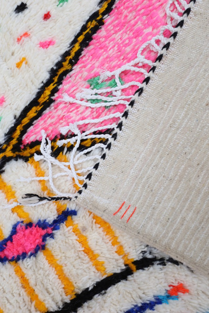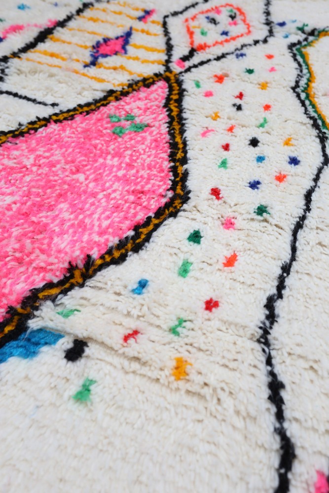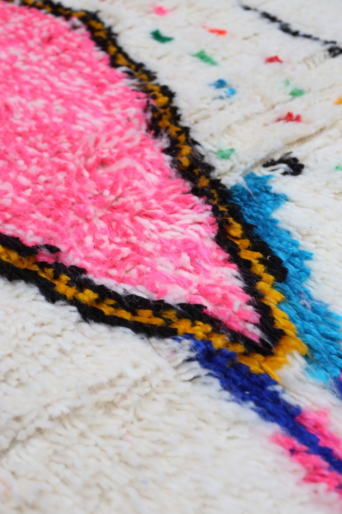 Deze Berberse tapijt genaamd Azilal dankt zijn naam aan de regio Azilal in Marokko waar het met de hand is geweven op een traditioneel houten weefgetouw. De patronen vertegenwoordigen de stemmingen, liefdes en verdriet van de weefster op het moment van creatie. Nadat dit gekleurde Berberse tapijt is gemaakt, zal ze een volledig ander tapijt maken, afhankelijk van haar emoties op dat moment. Elk stuk is dus uniek.