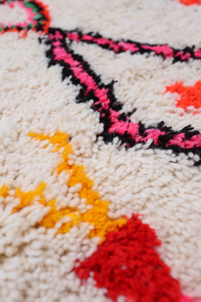 Deze Berberse tapijt genaamd Azilal dankt zijn naam aan de regio Azilal in Marokko waar het met de hand is geweven op een traditioneel houten weefgetouw. De patronen vertegenwoordigen de stemmingen, liefdes en verdriet van de weefster op het moment van creatie. Nadat dit gekleurde Berberse tapijt is gemaakt, zal ze een volledig ander tapijt maken, afhankelijk van haar emoties op dat moment. Elk stuk is dus uniek.