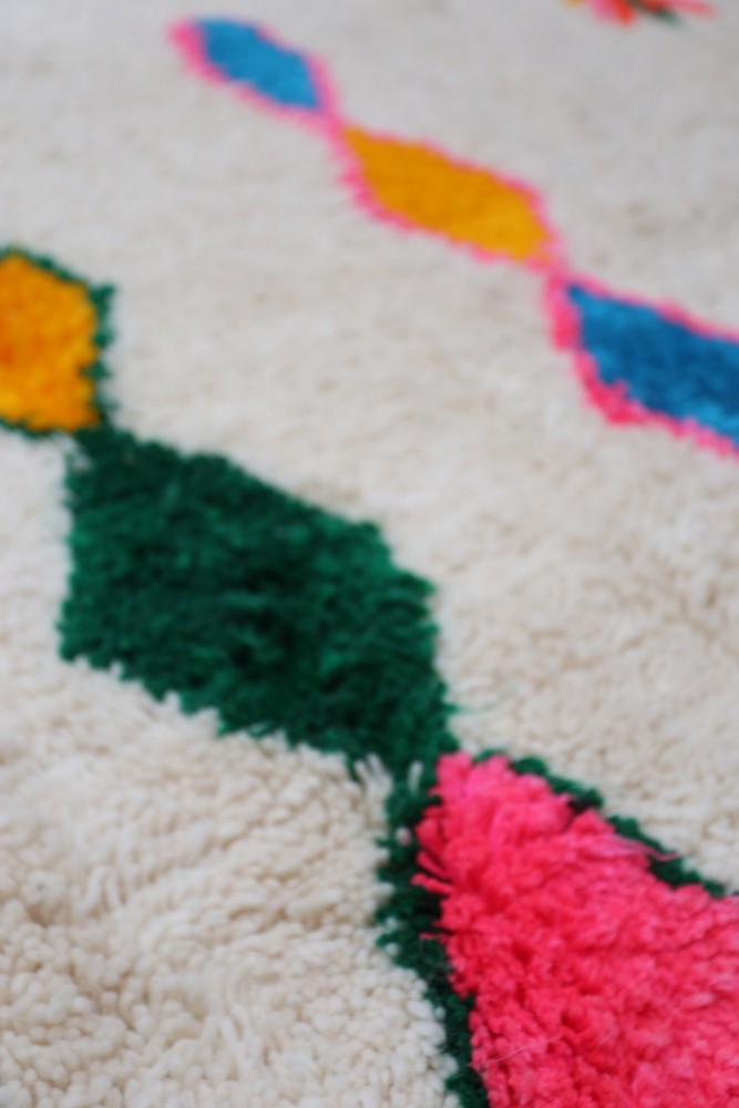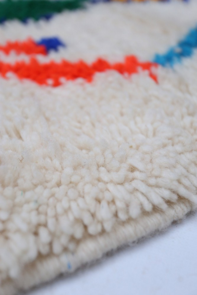 Deze Berberse tapijt genaamd Azilal dankt zijn naam aan de regio Azilal in Marokko waar het met de hand is geweven op een traditioneel houten weefgetouw. De patronen vertegenwoordigen de stemmingen, liefdes en verdriet van de weefster op het moment van creatie. Nadat dit gekleurde Berberse tapijt is gemaakt, zal ze een volledig ander tapijt maken, afhankelijk van haar emoties op dat moment. Elk stuk is dus uniek.